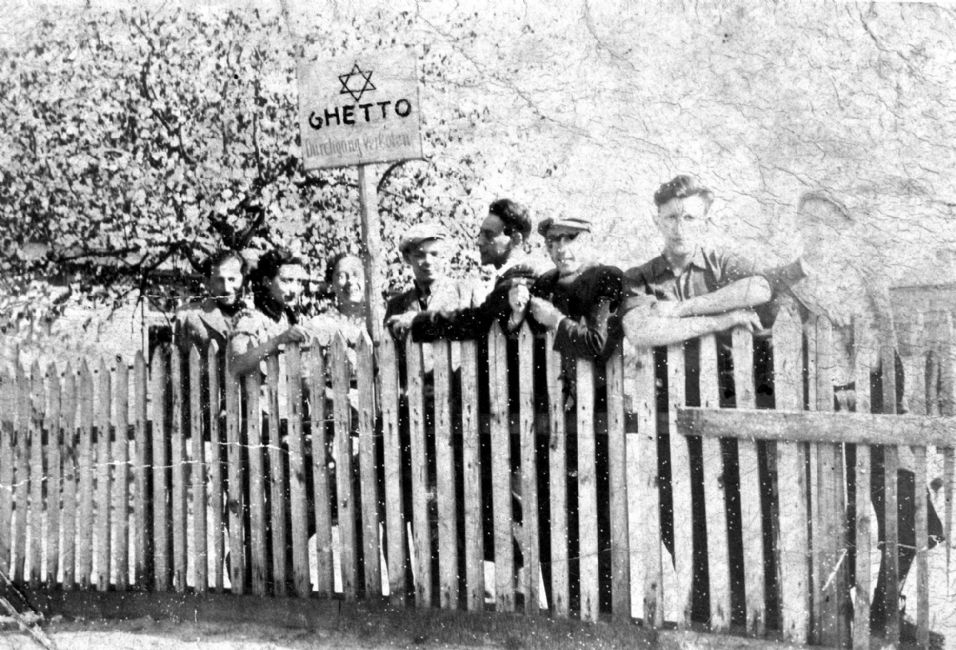 Poland ,Szadek, יהודים ליד שלט בגרמנית האוסר מעבר דרך הגטו.