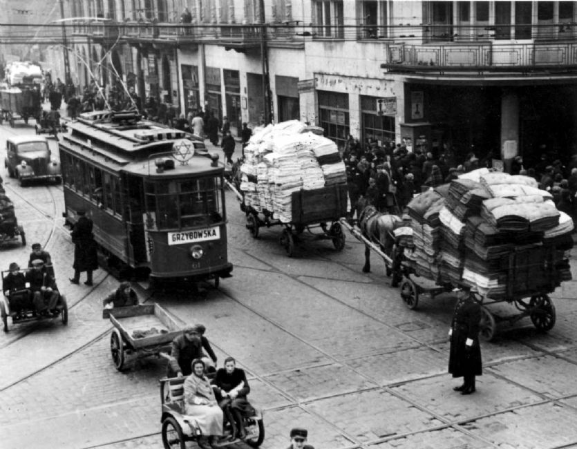 Poland ,Warsaw, עגלות, ריקשות וחשמלית ברחוב בגטו.