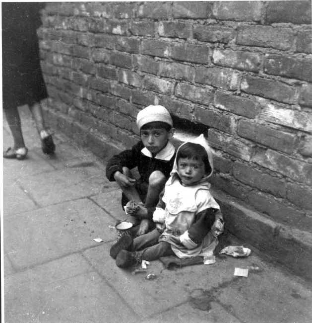 Poland ,Warsaw, ילדים יושבים על רצפת הרחוב ומקבצים נדבות.