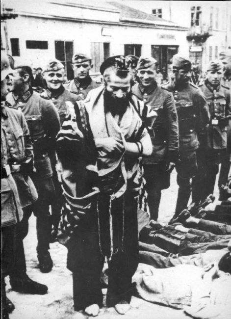 Poland ,Olkusz, שוטרים גרמנים משפילים את רבי משה בן יצחק הגרמן באירועי 'יום רביעי העקוב מדם', 31/07/1940. ארכיון יד ושם, 1541/1