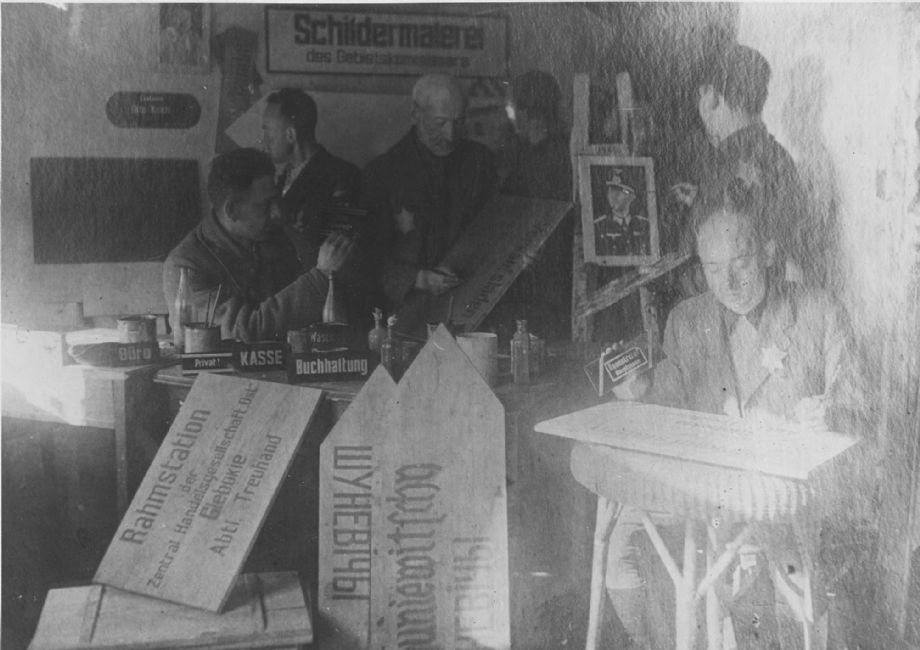 Poland ,Glebokie, עבודת כפייה, אנשים עובדים בבית חרושת לציור שלטים בגטו.