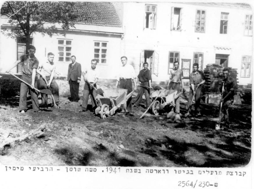 Poland, Warta, משה שוטן (רביעי מימין) ועובדי כפיה נוספים בגטו, 1941.