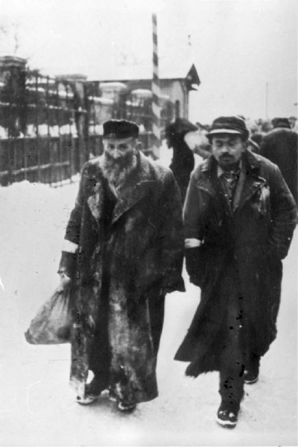 Poland, Zyrardow, יהודים מגורשים צועדים בשלג עם חפציהם.