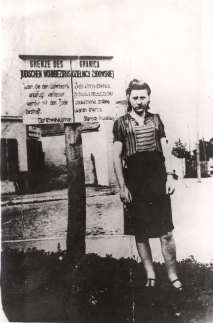 Poland ,Zwolen, אישה עומדת ליד שלט בכניסה לגטו.