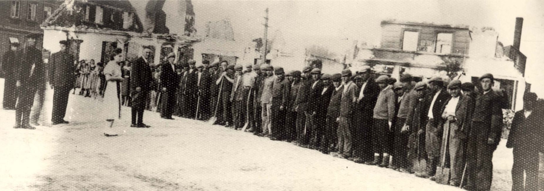 Poland, Uniejow יהודים מרוכזים בכיכר העיר לעבודות כפייה, 1940 לערך. ארכיון יד ושם, 6249