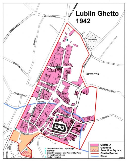 הקמת הגטו, מוסדותיו וניהול החיים בו. ב-24 במרס 1941 ציוו הגרמנים להקים גטו ברובע היהודי של לובלין. בתוך שבועות אחדים פונו מהאזור כל התושבים הפולנים ונותרו בו רק יהודים. במיפקד אוכלוסין שערך היודנרט כשנחתם הגטו ב-24 באפריל 1941 נמנו בגטו 34,149 נפשות. הגרמנים התירו לכ-2,200 יהודים לגור מחוץ לגטו. המחנה ברחוב ליפובה המשיך לפעול. תנאי התברואה והמזון לא היו גרועים כמו בגטאות אחרים כדוגמת גטו ורשה או גטו לודז'. היהודים לא הורשו לצאת מן הגטו ללא אישור, אך הגטו עדיין לא היה מגודר ולתושביו היה מגע עם העולם החיצוני. הייתה אפשרות להבריח מזון בהיקף גדול יחסית.