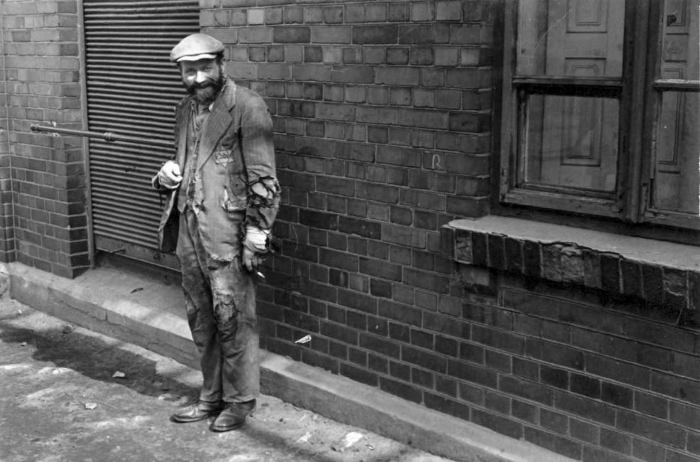 Poland ,Sosnowiec, יהודי לבוש בבלויי סחבות עומד ליד קיר בגטו.