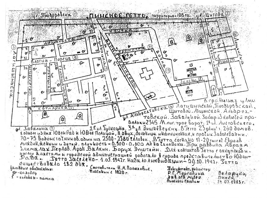הקמת הגטו, מוסדותיו וניהול החיים בו. באפריל 1942 הובאו לפינסק יהודים שגורשו מעיירות בסביבה. הגרמנים פרסמו את הפקודה בדבר הקמת הגטו, אך באמצעות שוחד עלה בידי היודנרט לדחות לזמן קצר את רוע הגזרה. ב-30 באפריל הוקם בפינסק גטו, והיהודים הצטוו לעבור אליו עד למחרת היום, 1 במאי 1942. הם הורשו לקחת אִתם רק כלי מטבח, כלי מיטה ומעט ביגוד. גרמנים ושוטרים פולנים ששמרו בשערי הגטו החרימו סחורות מוברחות והכו את המבריחים. כדי לשמור על הסדר הוגדל שירות הסדר היהודי ל-50 שוטרים.