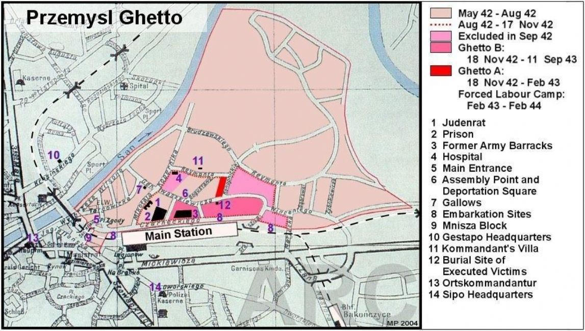 הקמת הגטו, ניהול החיים בו וחיסולו. בתחילת יולי 1942 הוכרז על הקמת גטו באזור שכבר מתחילת הכיבוש הגרמני רוכזו בו יהודים שגורשו מבתיהם בשכונות לא יהודיות. עד אמצע יולי 1942 רוכזו בשטח המצומצם שיועד לגטו כל יהודי העיר, ועד מהרה צורפו אליהם גם יהודים מיישובי הסביבה ובהם בירצ'ה (Bircza), קז'יווצ'ה (Krzywcza), ניזנקוביצה (Nizankowice) ודינוב (Dynow). מספר תושבי הגטו נע בין 22,000 ל- 24,000, והם מילאו כל פינה בו בצפיפות גדולה. היציאה מהגטו ללא רישיון נאסרה, והעוברים על האיסור היו צפויים לעונש מוות. בגטו נפוצו שמועות על השמדת קהילות יהודיות בסביבה ורבים חיפשו חסינות במקומות עבודה "טובים" במחנות הוורמכט. היו ששילמו שוחד רב כדי להתקבל לשורות עובדיהם.