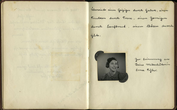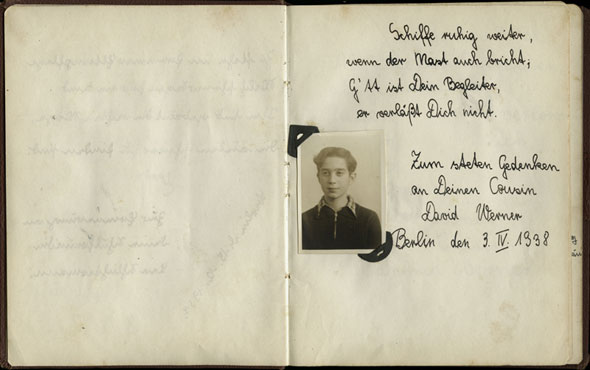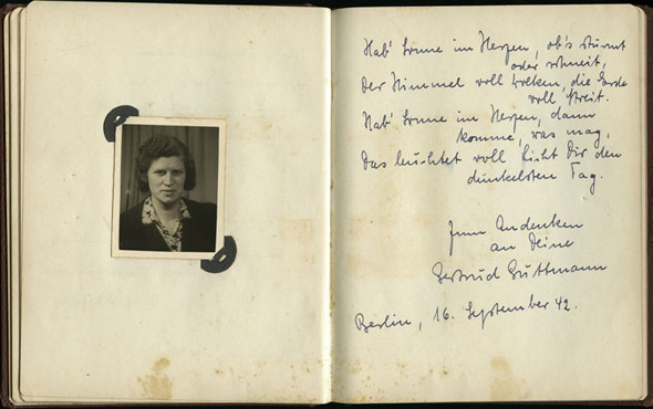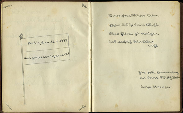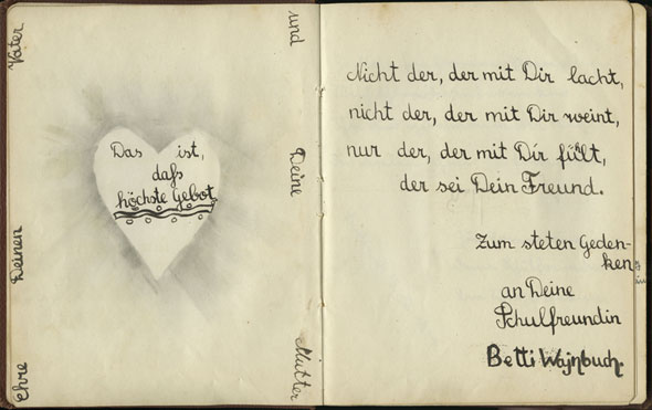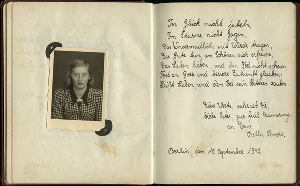 Diese Worte schrieb die 16 Jahre alte Schulkameradin Bella Lassore am 15. September 1942 in Ester Goldsteins Poesiealbum. Ester Goldstein lebte mit ihren Eltern und Geschwistern in Berlin. Über mehrere Jahre führte sie ein Poesiealbum, in welchem ihr Familienmitglieder, Lehrer und Freunde Eintragungen widmeten. Die Widmung von Bella war eine der letzten, die in dem Album erscheinen. Am 26. Oktober 1942 wurde Ester nach Riga deportiert. Bella wurde am 12. Januar 1943 auf einem Deportationszug nach Auschwitz geschickt. Beide Mädchen kamen ums Leben. Das Poesiealbum, sowie andere Familiendokumente, wurden Yad Vashem von Esters Schwester Margot, der einzigen Überlebenden der Familie, überreicht. Mehr...