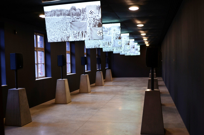 La fila de altavoces a ambos lados de la sala y las pantallas que cuelgan del cielo raso muestran los textos, las fotos y las voces en alemán, con traducción al polaco, inglés y hebreo. Los dogmas y principios nazis golpean los sentidos y con toda intención transmiten el ambiente de terror y agresión característicos del nazismo. Aquí se exhiben las raíces del Holocausto: la ideología nazi, fundamentada en una concepción del mundo racista y antisemita, fue la fuerza motriz principal detrás del Holocausto judío. Auschwitz-Birkenau -junto a los otros sitios y campos de exterminio- fue la más horrible y elaborada extensión de esa doctrina.