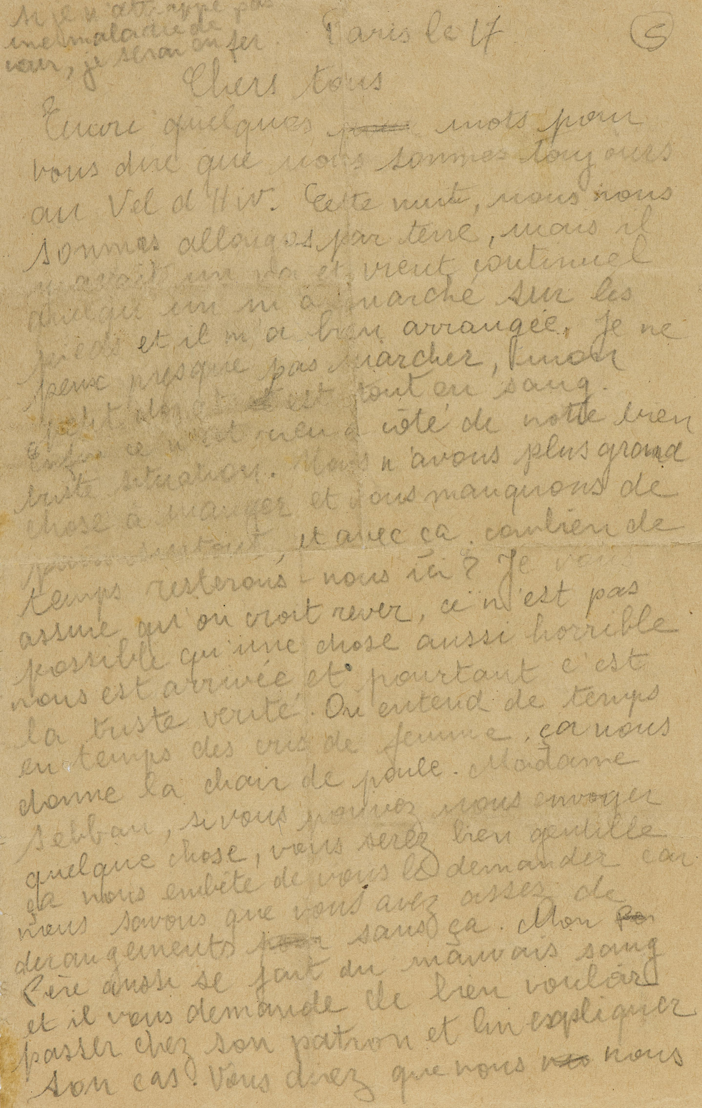 Encore quelques mots pour vous dire que nous sommes toujours au Vel d'Hiv. Cette nuit, nous nous sommes allongés par terre, mais il y avait un va-et-vient continuel, quelqu'un m'a marché sur les pieds et il m'a bien arrangée. Je ne peux presque pas marcher, mon petit doigt est tout en sang. Enfin, ce n'est rien à côté de notre bien triste situation. Nous n'avons plus grand-chose à manger et nous manquons de pain surtout, et avec ça, combien de temps resterons-nous ici ? Je vous assure qu'on croit rêver, ce n'est pas possible qu'une chose aussi horrible nous est [sic] arrivée et pourtant c'est la triste vérité. On entend de temps en temps des cris de femme, ça nous donne la chair de poule. Madame Sebban [sic], si vous pouvez nous envoyer quelque chose, vous serez bien gentille, ça nous embête de vous le demander car nous savons que vous avez assez de dérangements sans ça. Mon père aussi se fait du mauvais sang et il vous demande de bien vouloir passer chez son patron et lui expliquer son cas. Vous direz que nous nous trouvons tous ici. C'est rue d'Hauteville n°38 Mr Fontebride, ou s'il n'y a personne, chez Mr Brochard, 135, rue Vieille du Temple.